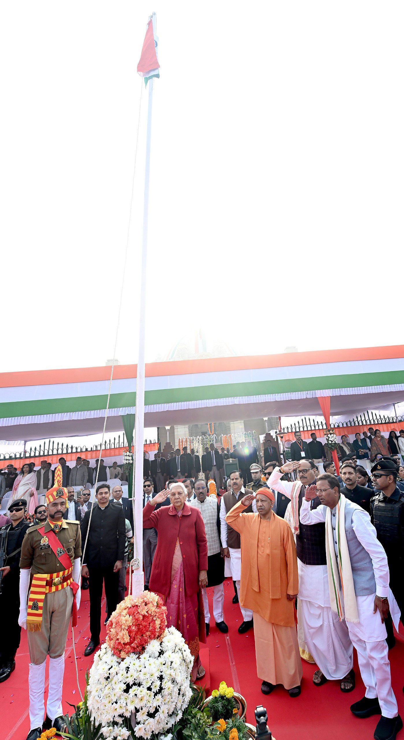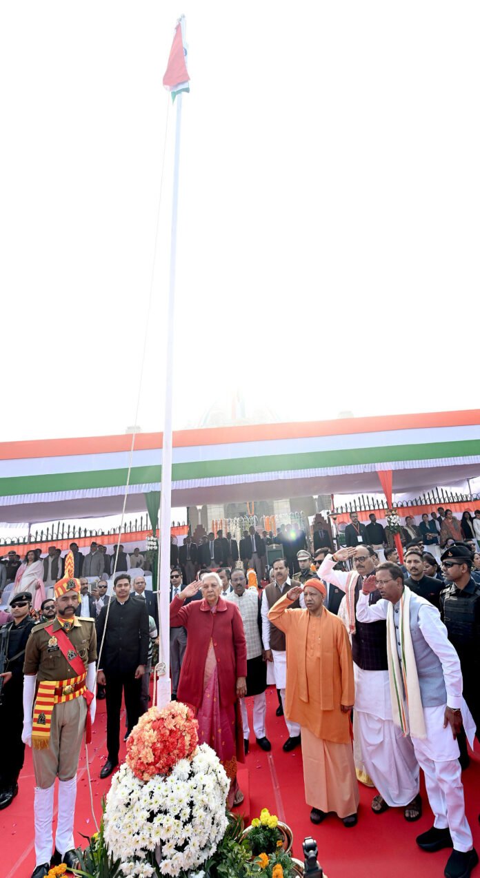 लखनऊ। 77वें गणतंत्र दिवस पर राजधानी लखनऊ में विधान भवन के सामने मुख्य समारोह का भव्य आयोजन किया गया। परंपरा के अनुसार राज्यपाल आनंदीबेन पटेल ने राष्ट्रध्वज फहराया और मुख्यमंत्री योगी आदित्यनाथ, केंद्रीय वित्त राज्य मंत्री पंकज चौधरी, उपमुख्यमंत्री ब्रजेश पाठक सहित अन्य गण्यमान्य अतिथियों की उपस्थिति में परेड की सलामी ली। इस दौरान हेलीकाप्टर से पुष्पवर्षा और देशभक्ति के गीतों से पूरा परिसर गणतंत्र दिवस के रंग में रंगा नजर आया।