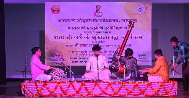 लखनऊ। भातखण्डे संस्कृति विश्वविद्यालय एवं भातखण्डे एलुमनी एसोसिएशन की ओर से शताब्दी वर्ष के उपलक्ष्य में सुरम्य सांगीतिक संध्या हुई। राय उमानाथ बली प्रेक्षागृह में सजी संध्या में एक से बढ़कर एक प्रस्तुति देखने को मिली। मुख्य अतिथि भातखण्डे संस्कृति विश्वविद्यालय की कुलपति प्रो. माण्डवी सिंह रहीं। कार्यक्रम में विश्वविद्यालय के पूर्व छात्र अक्षत अवस्थी ने शास्त्रीय संगीत की अनुपम प्रस्तुति देकर उपस्थित श्रोताओं को भाव-विभोर कर दिया। उन्होंने राग देवगिरी बिलावल में विलंबित तिलवाड़ा ताल में ए बना ब्याहन आयो प्रस्तुत किया। इसके बाद तीन ताल में छोटा ख्याल मानो जरा अब माननी तथा दादरा की सुमधुर प्रस्तुति से सभागार को रससिक्त कर दिया। उनकी गायकी में राग की शुद्धता, भाव की गहराई एवं तानों की सटीकता ने श्रोताओं को मंत्रमुग्ध कर दिया। अक्षत के साथ संगत में हारमोनियम पर दिनकर द्विवेदी, तबले पर मोहित दुबे एवं तानपुरा पर अभिषेक कुमार ने अपनी कुशल एवं सधे हुए वादन से कार्यक्रम को चार चांद लगा दिए। इस मौके पर कुलसचिव डॉ. सृष्टि धवन, डॉ. सीमा भारद्वाज, प्रो. सृष्टि माथुर, डॉ. रुचि खरे, गिरीश चंद्र बहुगुणा, डॉ. मीरा दीक्षित, आलोक कुमार पांडेय, हेमचंद्र पालीवाल सहित एलुमनी एसोसिएशन के अनेक गणमान्य सदस्य एवं संगीत प्रेमी बड़ी संख्या में उपस्थित रहे।