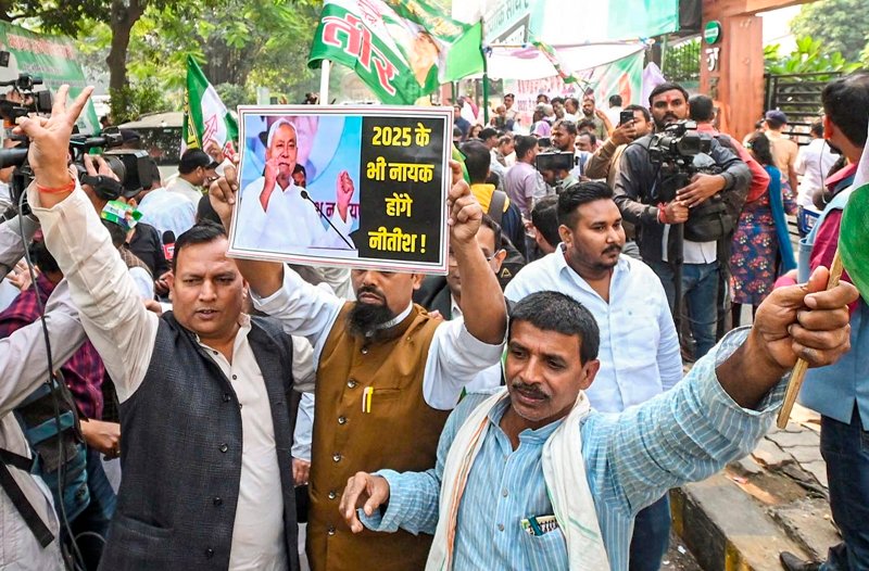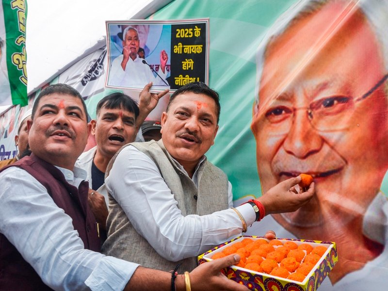निर्वाचन आयोग के दोपहर 12 बजे तक के आंकड़ों के अनुसार, राजग 243 सीट में से 186 सीट पर आगे था जबकि महागठबंधन लगभग 46 सीट पर ही बढ़त बनाए हुए था। राजग को करीब दो तिहाई से भी बड़े बहुमत की ओर बढ़ते देख जद(यू) कार्यकर्ताओं ने मुख्यमंत्री नीतीश कुमार जिंदाबाद के नारे लगाने शुरु कर दिए और आतिशबाजी की। कुछ कार्यकर्ताओं ने हाथ में नीतीश कुमार का एक बड़ा पोस्टर ले रखा था तो कई सारे कार्यकर्ताओं के हाथों में पार्टी का झंडा था। एक उत्साहित कार्यकर्ता ने कहा, नीतीश जी की पांचवी जीत तय है’… बस औपचारिकताएं बाकी हैं!