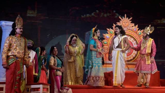 कोलकाता और लखनऊ के कलाकारों द्वारा श्रीकृष्ण लीला का मंचन द्रौपदी स्वयंवर से आरंभ किया गया, अज्ञातवास के दौरान जब पांडव भेष बदल कर रह रहे थे उसी समय पर राजा द्रुपद द्वारा घोषणा की जाती है कि जो भी पानी में प्रतिबिंब देखकर उस पर धनुष से तीर चलाकर ऊपर टंगी हुई मछली पर सटीक निशाना लगा देगा उसी को द्रौपदी द्वारा वरमाला पहनाई जाएगी।