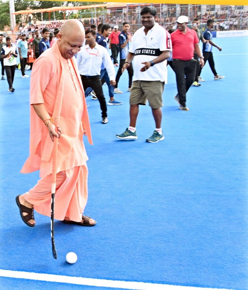 Hon'ble Chief Minister of Uttar Pradesh Shri Yogi Adiyanath tries his hand at Hockey while inaugurating various development initiatives in Jhansi on National Sports Day. Also present was Dr. R.P. Singh General Secretary of Uttar Pradesh Hockey.