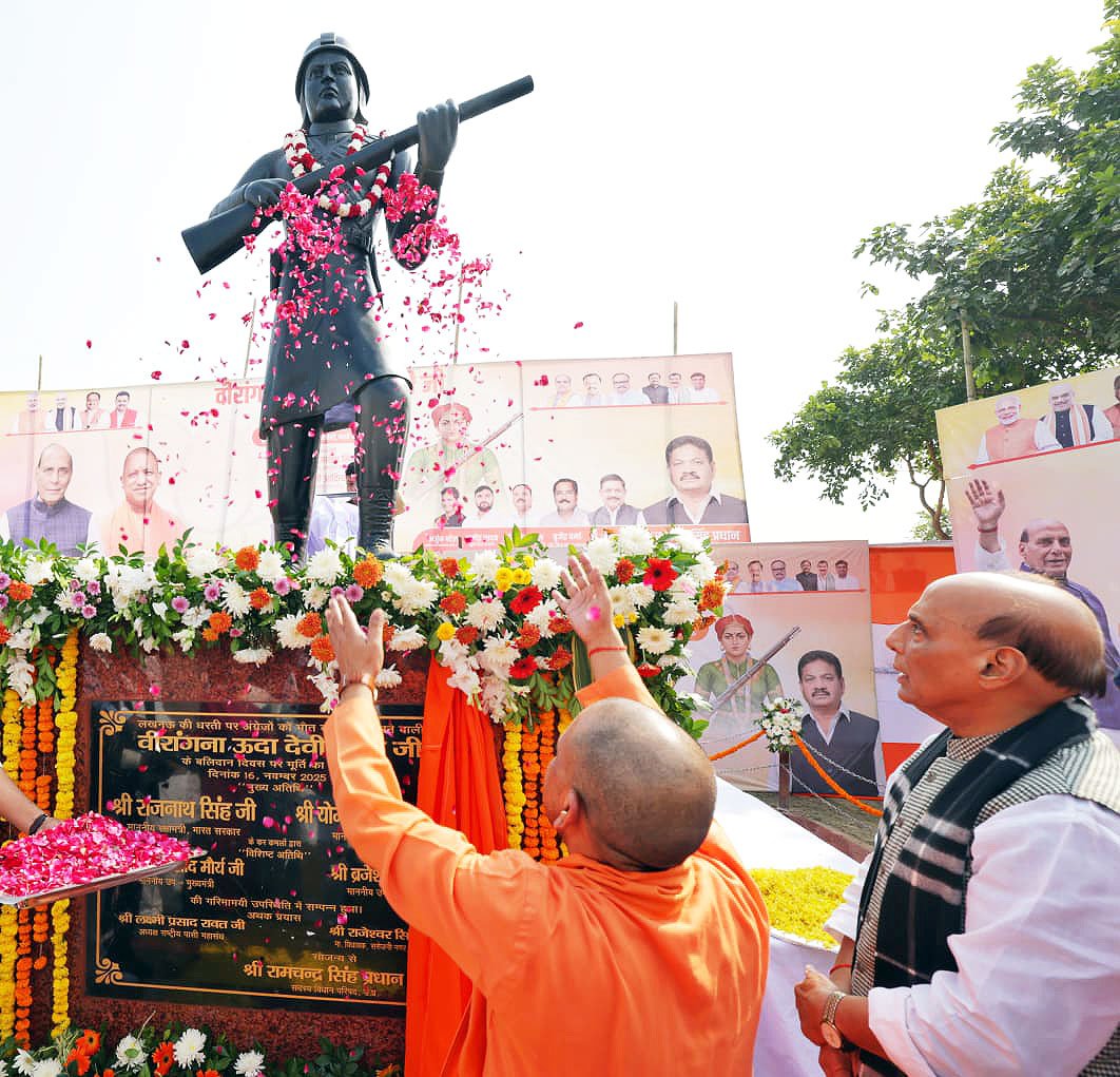 योगी आदित्यनाथ ने रक्षा मंत्री राजनाथ सिंह के साथ रविवार को यहां सेक्टर-19 वृंदावन कॉलोनी, पासी चौराहे पर वीरांगना ऊदा देवी पासी की प्रतिमा का अनावरण और स्वाभिमान समारोह का उद्घाटन करने के बाद कहा, ”नारी और वंचित का सम्मान ‘डबल इंजन’ सरकार का मुख्य ध्येय है और वीरांगना ऊदा देवी हमें याद दिलाती हैं कि नारी शक्ति कितनी सामर्थ्यवान है।