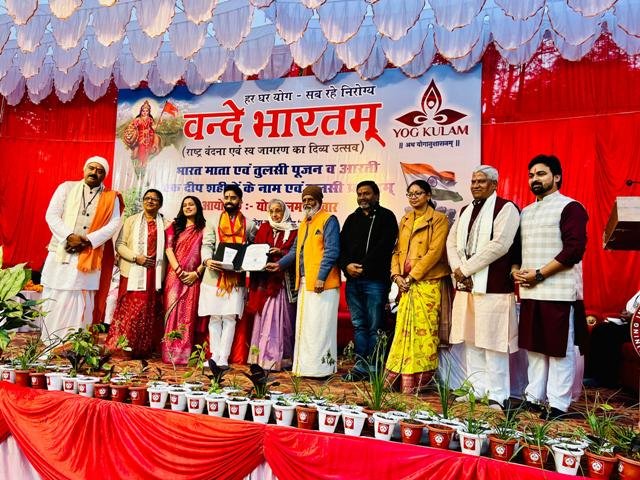 इस अवसर पर योगा यूनिवर्सिटी आॅफ अमेरिका के वाइस प्रेसिडेंट डॉ. योगी देवराज ने योग शिक्षा एवं योग के प्रचार-प्रसार के क्षेत्र में विशिष्ट योगदान हेतु योगकुलम के संस्थापक मनीष प्रताप सिंह को मानद डॉक्टरेट उपाधि से अलंकृत किया। इस मौके पर विशिष्ट अतिथि डा, योगी देवराज ने कहा कि आज के समय में ऐसे आयोजनों की अत्यंत आवश्यकता है, जब समाज तीव्र गति से पाश्चात्य संस्कृति की ओर अग्रसर हो रहा है। ऐसे में वन्दे भारतम जैसे उत्सव समाज को उसकी मूल संस्कृति, संस्कार और राष्ट्रीय चेतना से पुन: जोड़ने में महत्वपूर्ण भूमिका निभाते हैं। योगकुलम के प्रमुख मनीष प्रताप सिंह ने बताया कि योगकुलम विगत 13 वर्षों से हर घर योग – सब रहें निरोग के संकल्प के साथ राष्ट्रसेवा में समर्पित भाव से कार्य कर रहा है। राम कथा व्यास दिलीप शुक्ल ने कहा कि भारत माता पूजन समाज में व्याप्त धर्म, पंथ, जातिवाद, क्षेत्रवाद, भाषावाद एवं लिंग-भेद से ऊपर उठकर एक ऐसे समरस समाज का निर्माण करता है, जो राष्ट्र प्रथम की भावना से ओतप्रोत हो। वहीं तुलसी पूजन को उन्होंने सनातन संस्कृति के पुनर्जागरण का प्रतीक बताया। संचालन डा राम कृष्ण पाण्डेय ने किया।