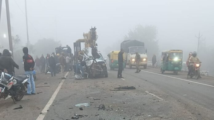 ग्वालियर (मध्य प्रदेश)। महाराजपुरा थाना क्षेत्र के बरेठा टोल प्लाजा के पास सुबह करीब 9 बजे घने कोहरे और धुंध की वजह से भिंड से आ रही एक कार और ग्वालियर की ओर से जा रहे ट्रक के बीच आमने-सामने की जोरदार भिड़ंत हो गई। टक्कर इतनी भीषण थी कि कार का अगला हिस्सा पूरी तरह चकनाचूर हो गया और ट्रक के भीतर जा घुसा। इस भयावह मंजर का अंदाजा इसी बात से लगाया जा सकता है कि एक युवक का शव कार के इंजन में बुरी तरह फंस गया था, जिसे निकालने के लिए पुलिस को क्रेन की मदद लेनी पड़ी। हादसे के बाद नेशनल हाईवे पर काफी देर तक लंबा जाम लगा रहा, जिसे पुलिस बल ने कड़ी मशक्कत के बाद खुलवाया।