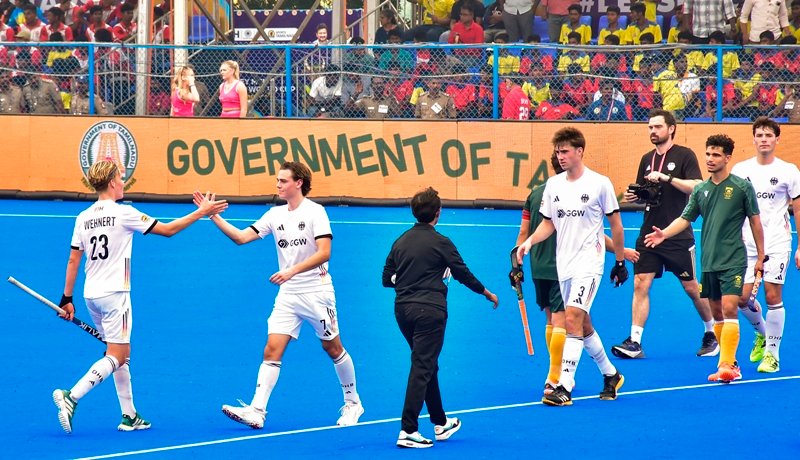 मदुरै । गत चैंपियन जर्मनी ने शुक्रवार को यहां दक्षिण अफ्रीका को 4-0 से हराकर एफआईएच पुरुष हॉकी विश्व कप में अपने अभियान की शुरूआत शानदार जीत के साथ की। सात बार के चैंपियन जर्मनी की ओर से जस्टस वारवेग ने 19वें और 56वें मिनट में मैदानी गोल दागे जबकि बेन हैशबैक (43वें मिनट) और पॉल ग्लेंडर (44वें मिनट) ने पेनल्टी कॉर्नर पर एक-एक गोल किया। पूल ए के पहले मैच में आयरलैंड ने कड़े मुकाबले में कनाडा को 4-3 से हराया।