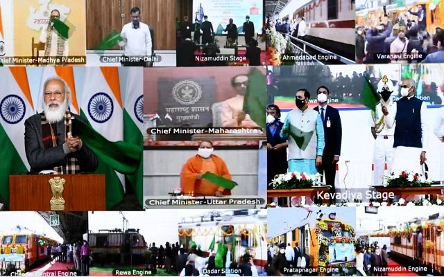 अहमदाबाद। प्रधानमंत्री नरेंद्र मोदी ने देश के विभिन्न हिस्सों को गुजरात के केवडय़िा से जोडऩे वाली आठ ट्रेनों को रविवार को वीडियो कॉन्फ्रेंस के जरिए हरी झंडी दिखाई। केवड़िया में ही सरदार पटेल की प्रतिमा स्टैच्यू ऑफ यूनिटी है। उन्होंने अतीत में देश में कामकाज के तौर तरीकों का उदाहरण देते हुए समर्पित माल ढुलाई गलियारे (डेडिकेटिड फ्रेट कॉरिडोर) का जिक्र किया।