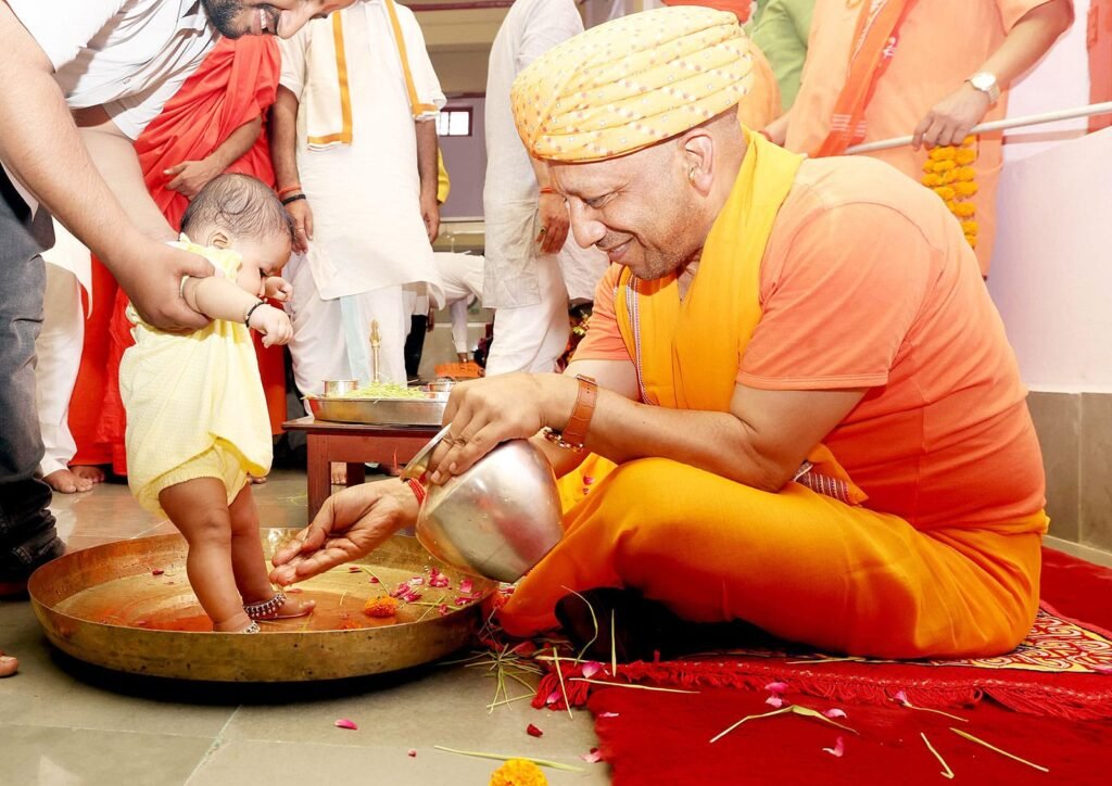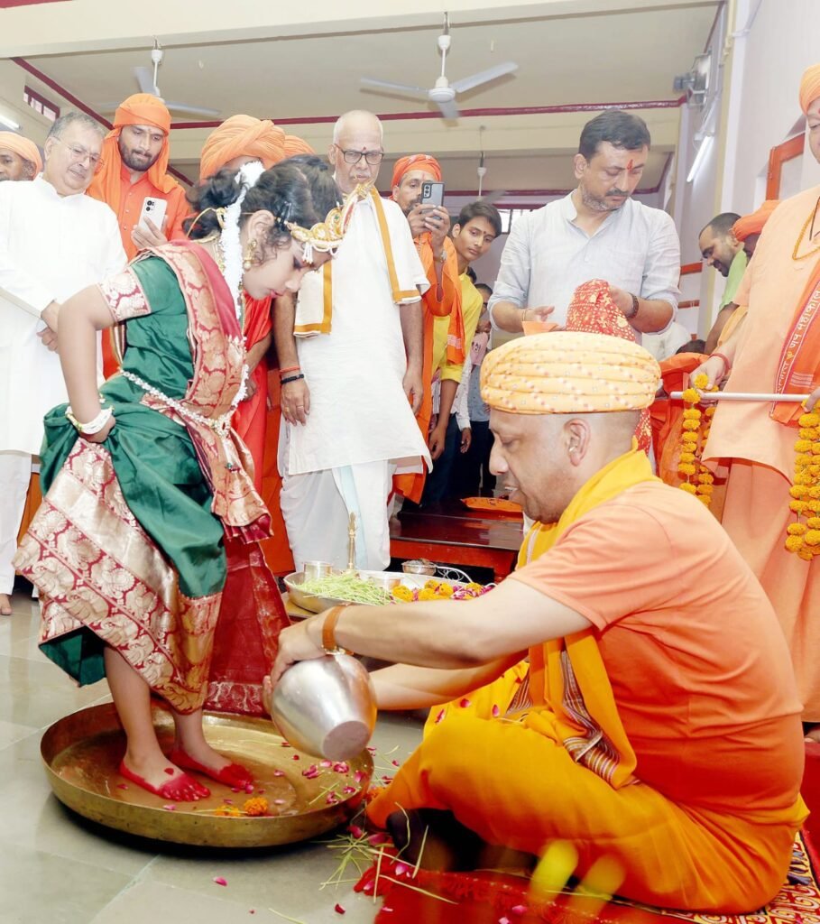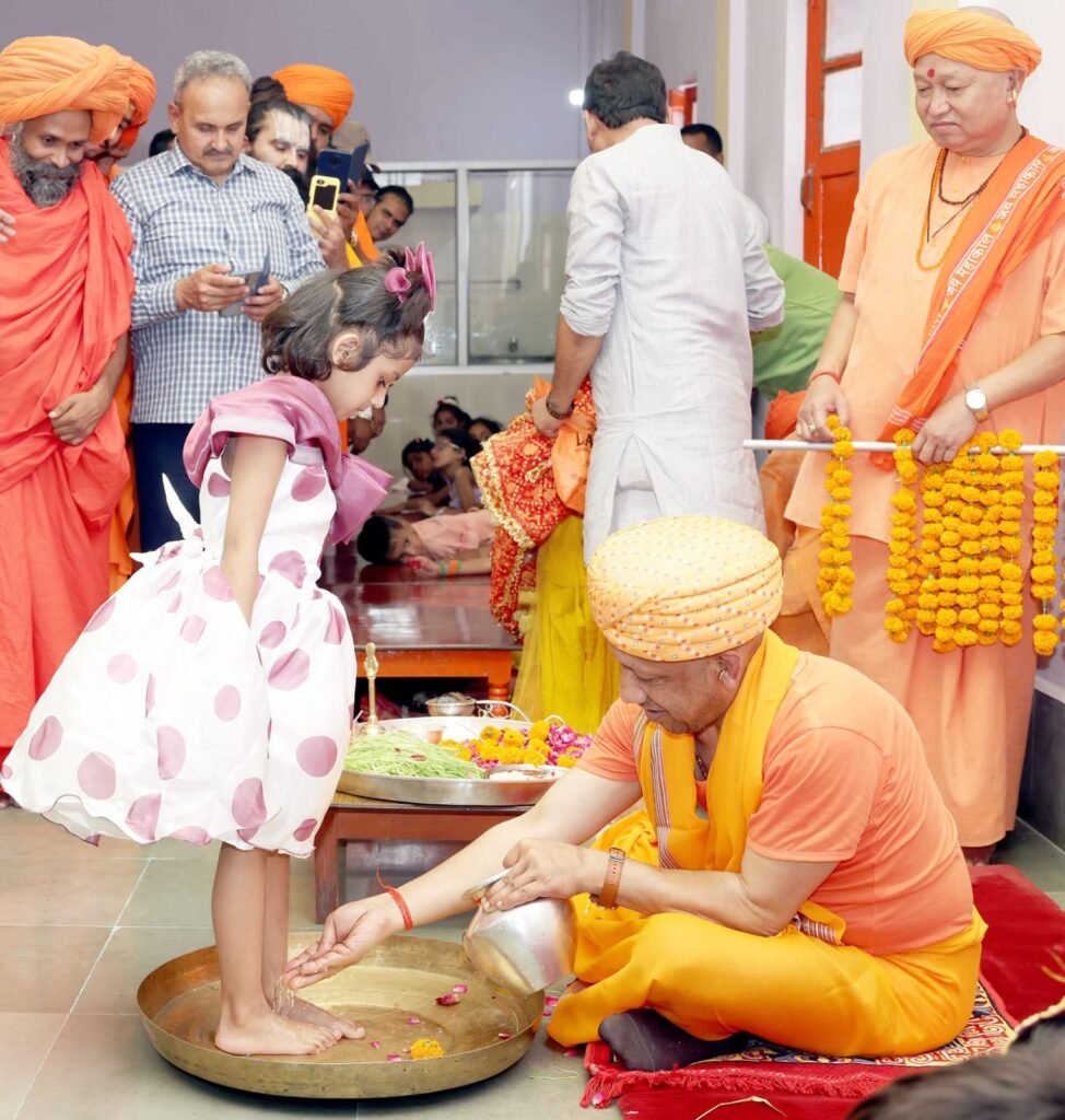 माला पहनाकर, चुनरी ओढ़ाकर, उपहार एवं दक्षिणा प्रदान कर आशीर्वाद लिया। इस दौरान उन्होंने एक छह माह की बच्ची के भी पांव पखारे और पूजन कर आशीर्वाद लिया। मुख्यमंत्री ने हनुमानजी के वेश में आए एक बालक को भी तिलक लगाया और माला पहनाकर अंगवस्त्र ओढ़ाया। पूजन के बाद कन्याओं और बटुकों को मंदिर की रसोई में पकाया गया ताजा भोजन प्रसाद सीएम योगी ने अपने हाथों से परोसा। नौ कन्याओं के अतिरिक्त बड़ी संख्या में पहुंची बालिकाओं और बटुकों का भी मुख्यमंत्री ने पूजन कर आरती उतारी। सभी को श्रद्धापूर्वक भोजन कराकर उपहार व दक्षिणा दिया गया।