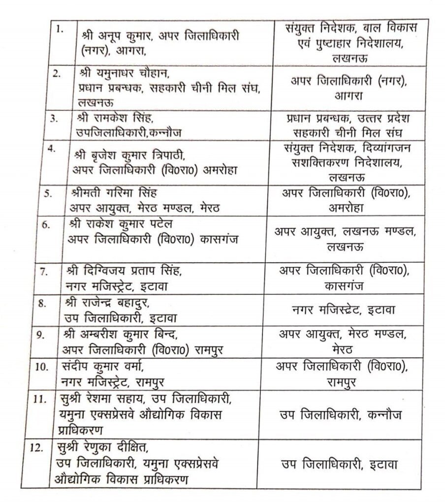 तबादला सूची में शामिल प्रमुख नाम में अनूप कुमार, अपर जिलाधिकारी (नगर), आगरा को संयुक्त निदेशक, बाल विकास एवं पुष्टाहार निदेशालय, लखनऊ के पद पर स्थानांतरित किया गया है। यमुनाधर चौहान, प्रधान प्रबन्धक, सहकारी चीनी मिल संघ, लखनऊ से स्थानांतरित होकर अपर जिलाधिकारी (नगर), आगरा बनाए गए हैं। रामकेश सिंह, उप जिलाधिकारी, कन्नौज को प्रधान प्रबन्धक, उत्तर प्रदेश सहकारी चीनी मिल संघ के रूप में नई जिम्मेदारी सौंपी गई है।बृजेश कुमार त्रिपाठी, अपर जिलाधिकारी (वि0रा0), अमरोहा को संयुक्त निदेशक, दिव्यांगजन सशक्तिकरण निदेशालय, लखनऊ बनाया गया है।