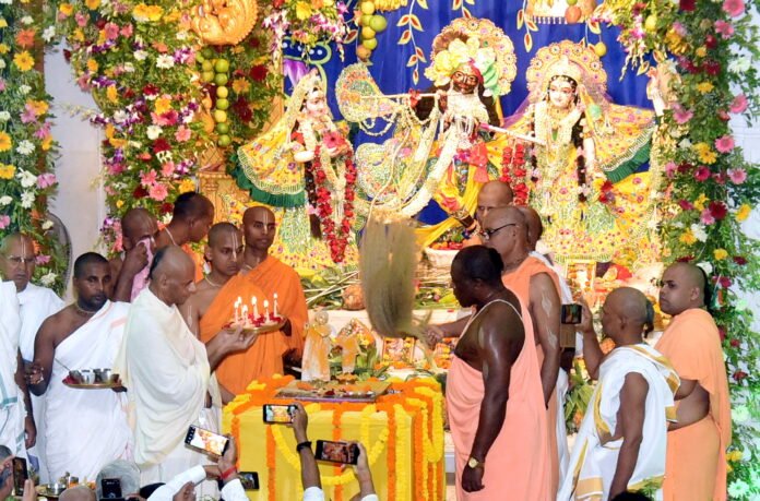 योगी ने शिशु कृष्ण की मूर्ति को गर्भगृह से बाहर निकाला, उन्हें फूलों के पालने में बिठाया और झूलन की रस्म निभाई, साथ ही आरती और “नंद घर आनंद भयो” और अन्य पारंपरिक भजनों का आनंदपूर्वक गायन भी किया। मंदिर परिसर देर रात तक श्रद्धालुओं से भरा रहा। कृष्ण-राधा वेश-भूषा प्रतियोगिताओं में भी बच्चों ने उत्साहपूर्वक भाग लिया और विभिन्न श्रेणियों में बच्चों को पुरस्कार प्रदान किए गए। प्रसिद्ध लोक गायक डॉ. राकेश श्रीवास्तव और उनकी मंडली के नेतृत्व में आयोजित भजन संध्या ने भक्ति गीतों और पारंपरिक ‘सोहर’ की प्रस्तुति दी गई।