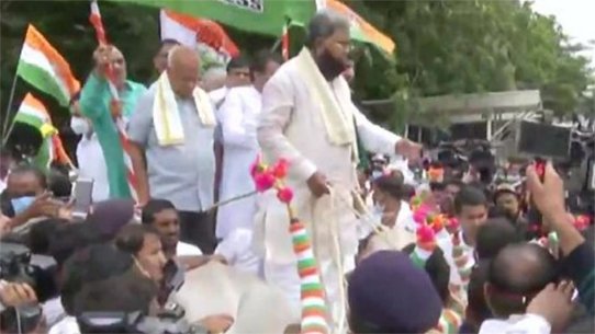 कर्नाटक : बैलगाड़ी में सवार होकर विधानसभा पहुंचे सिद्धरमैया और शिवकुमार
