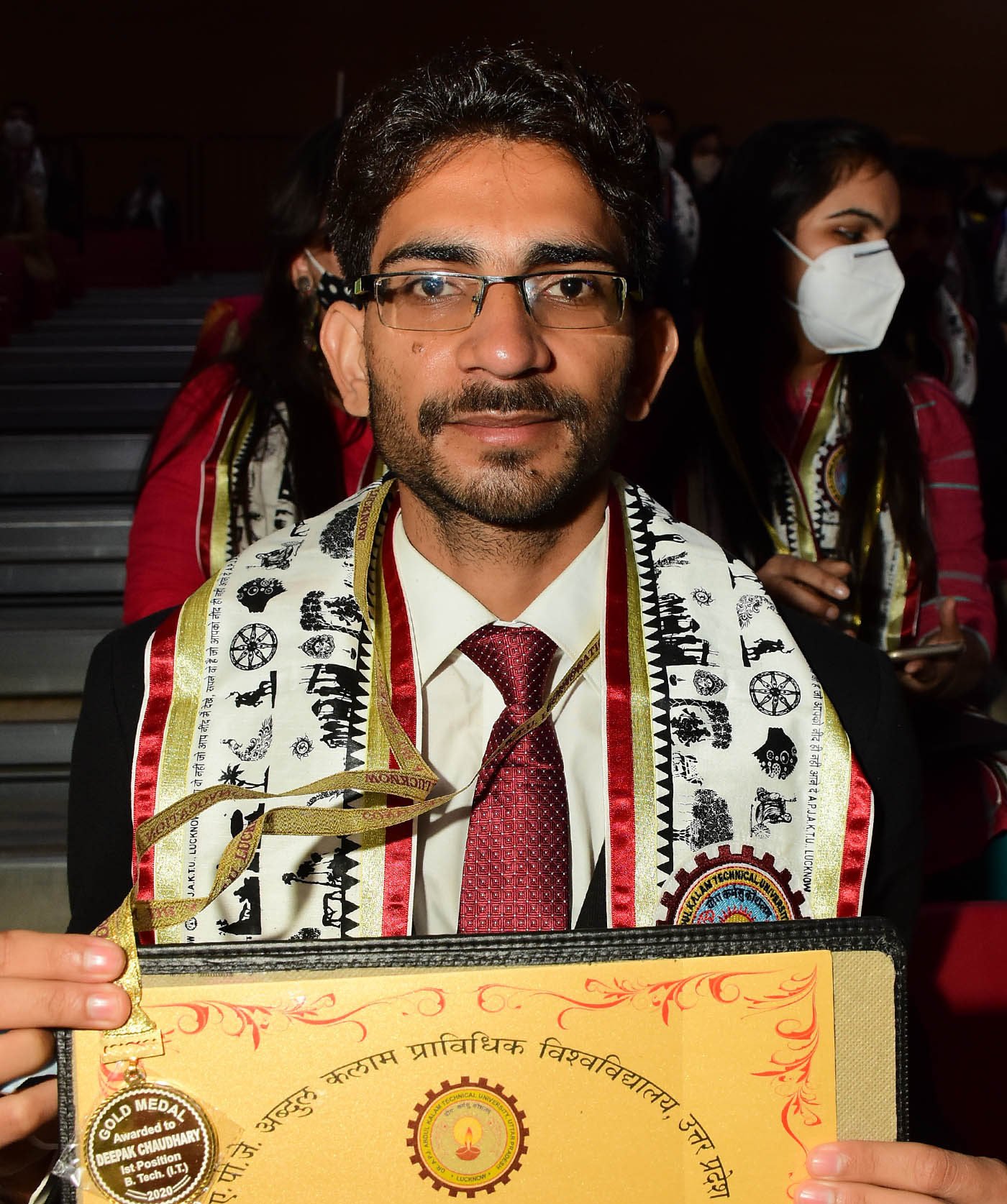 बीबीडी नेशनल इंस्टीट्यूट आफ टेक्नोलॉजी एंड मैनेजमेंट के मेधावी छात्र दीपक चौधरी को इंफारमेंशन टेक्नोलॉजी में स्वर्ण पदक मिला है। उनका कहना है कि विश्वविद्यालय में शैक्षणिक माहौल बहुत अच्छा है। शिक्षक पढ़ाने के दौरान सहयोग करते है और उच्च शिक्षा के नित नये आयाम के बारे में भी जानकारी देते है। यह केवल पढ़ाने तक ही नहीं बल्कि व्यक्तिगत समस्या पर होने पर भी साथ देते है। उन्होंने बताया कि घर मथुरा में होने के बावजूद शिक्षकों के कारण कभी यह नहीं लगा कि मैं घर के बाहर हूं। उनका कहना है कि आईटी विभाग की अध्यक्ष डा. रिचा शर्मा ने काफी सहयोग किया। दीपक को सबसे अधिक नेटवर्किंग विषय में रूचि है। इनके पिता अमर सिंह किसान है और माता वीना देवी गृहणी है। परिवार में दो छोटे भाई और एक छोटी बहन है। वह प्रतिदिन चार घंटे पढ़ाई करते थे।