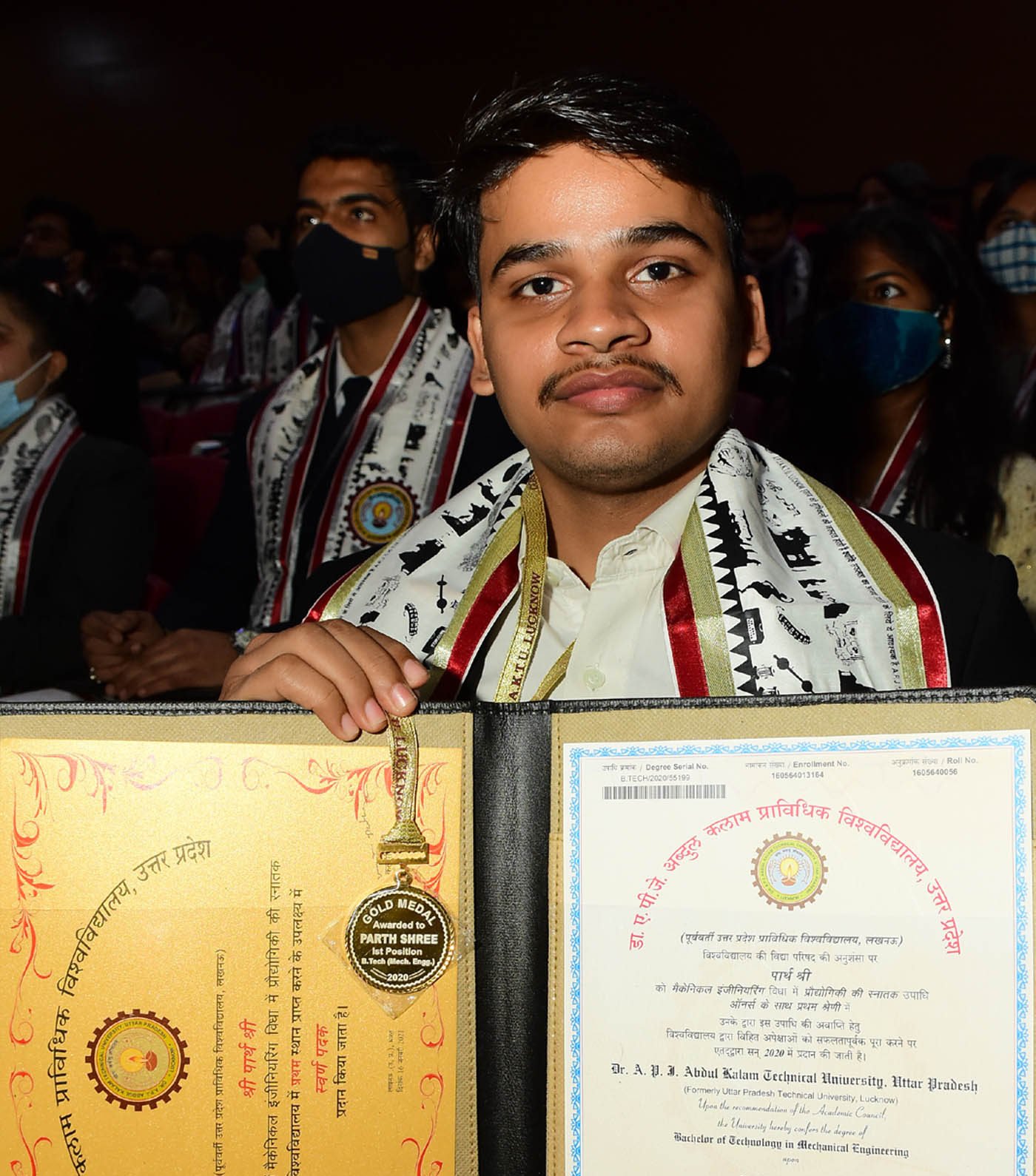 बीबीडी नार्देन इंडिया इंस्टीट्यूट आफ टेक्नोलॉजी के मेधावी छात्र पार्थश्री को मैकेनिककल इंजीनियरिंग में स्वर्ण पदक प्राप्त किया है। पार्थश्री ने बताया कि यूपीएससी से आईईएस करने की तैयार कर रहे है। साथ ही रिसर्च करना चाहते है। उन्होने बताया कि बीबीडी में पढ़ाई का अच्छा माहौल है। साथ पढ़ाई के अलावा यदि छात्र का अन्य विद्या में रूचि है तो विश्वविद्यालय के शिक्षक उसे उस विद्या में भी मजबूत करते है। फिर चाहें वह पांरपरिक व सांस्कृतिक हो। शिक्षक छात्रों का व्यवहारिक संबंध रहता है। इनके पिता दिनेश कुमार वर्मा सरस्वती विद्या मंदिर में शिक्षक है और माता गीता वर्मा गृहणी है। उन्हें डिजाइन का विषय में अधिक रूचि है। इनके परिवार में बड़े भाई पीएसयू शोध क्षेत्र में कार्यरत है।