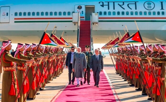 प्रधानमंत्री मोदी सोमवार को शाह अब्दुल्ला द्वितीय के निमंत्रण पर दो दिवसीय यात्रा पर जॉर्डन की राजधानी अम्मान पहुंचे। प्रधानमंत्री मोदी की चार दिवसीय तीन देशों की यात्रा का पहला पड़ाव जॉर्डन है। इसके बाद वह इथियोपिया और ओमान भी जाएंगे।भारत और जॉर्डन ने सोमवार को द्विपक्षीय संबंधों और मित्रता को बड़ा प्रोत्साहन देने के उद्देश्य से संस्कृति, नवीकरणीय ऊर्जा, जल प्रबंधन, डिजिटल सार्वजनिक अवसंरचना तथा पेट्रा और एलोरा के बीच ‘ट्विनिंग’ (जुड़वां) व्यवस्था के क्षेत्रों में समझौता ज्ञापनों (एमओयू) पर हस्ताक्षर किए।