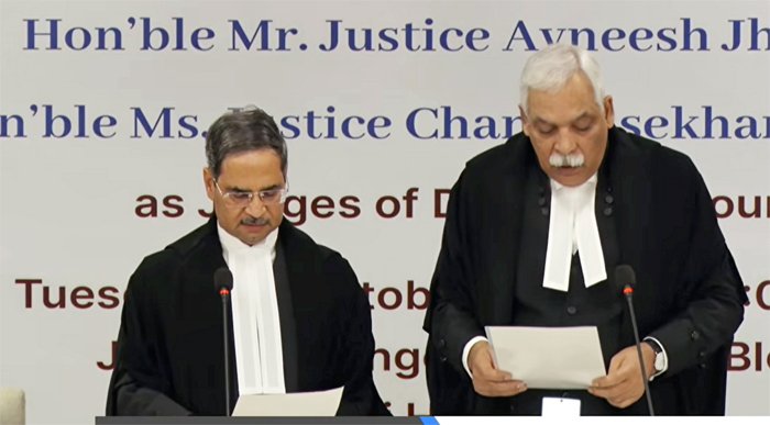 नयी दिल्ली। दिल्ली उच्च न्यायालय में मंगलवार को तीन नए न्यायाधीशों न्यायमूर्ति दिनेश मेहता, न्यायमूर्ति अवनीश झिंगन और न्यायमूर्ति चंद्रशेखरन सुधा ने पद की शपथ ली।