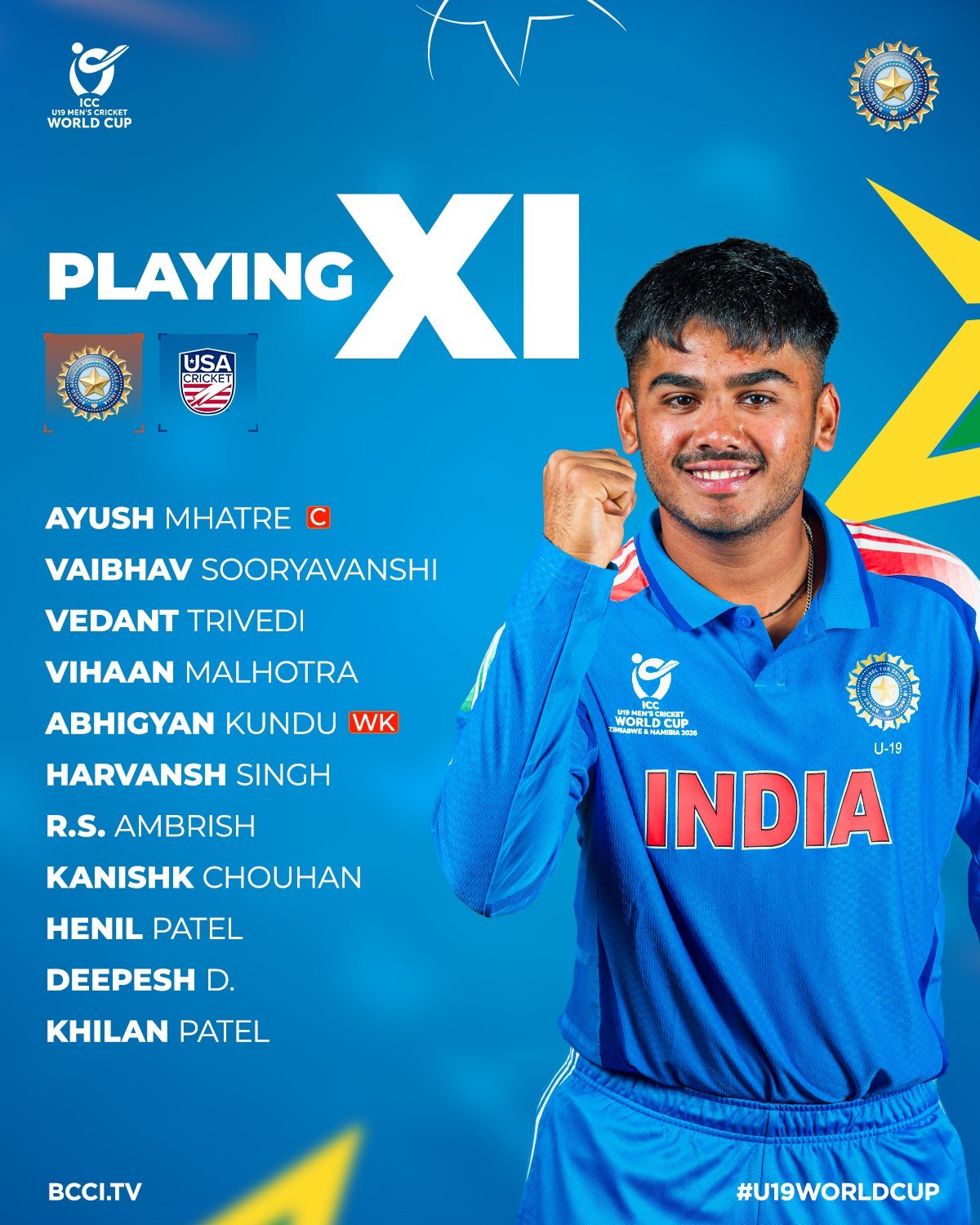 बुलावायो (जिम्बाब्वे)। भारत के कप्तान आयुष म्हात्रे ने बृहस्पतिवार को यहां अंडर-19 विश्व कप के पहले मैच में अमेरिका के खिलाफ टॉस जीतकर पहले गेंदबाजी करने का फैसला किया। रिकॉर्ड छठा खिताब जीतने के लिए चुनौती पेश कर रहे भारत की टीम में वैभव सूर्यवंशी जैसे स्टार बल्लेबाज के अलावा आरोन जॉर्ज और विहान मल्होत्रा जैसे शानदार बल्लेबाज भी हैं। भारत का पहले गेंदबाजी करने का फैसला शायद आसमान में बादल छाए होने की वजह से हो सकता है जिससे उसके तेज गेंदबाजों, विशेषकर लंबे कद के दीपेश देवेंद्रन को शुरूआत में मदद मिल सकती है। अमेरिका की कप्तानी उत्कर्ष श्रीवास्तव कर रहे हैं।
